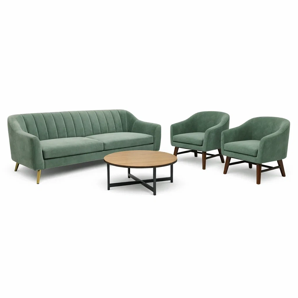 Set di divani Tre Pezzi in Tessuto Verde con Poltrone e Tavolino Rotondo in Legno
