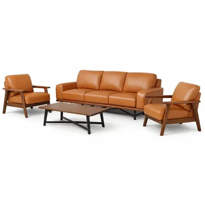 Set di divani con Divano Tre Posti e Poltrone in Pelle Colore Noce e Tavolino in Legno e Metallo